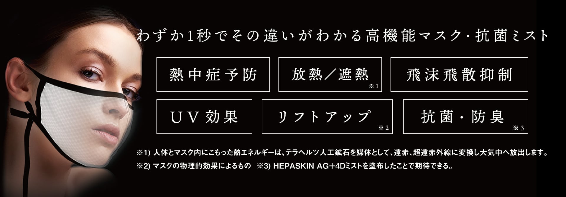生地は有名アパレルブランドにも使われる保温素材に、美顔ローラーに使われるテラヘルツ鉱石を含むレアメタル鉱石+メタライズ加工(ラメラメ)を施した、抗菌・防臭・高保湿に優れた「温感持続型高機能マスク」。